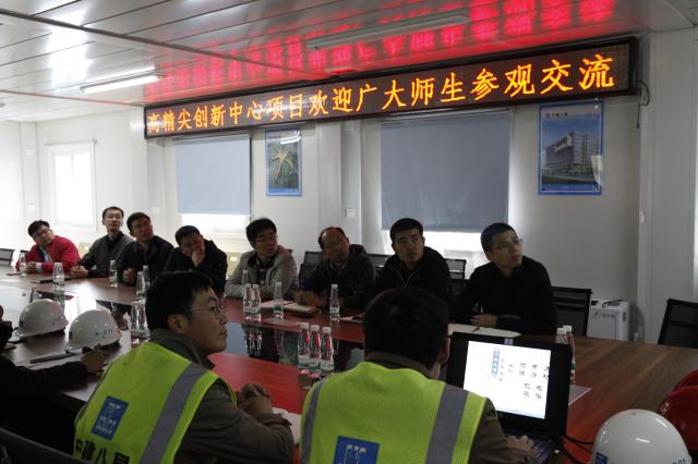 参观师生在高精尖创新中心建设项目部会议室,与施工单位工作人员进行了深度座谈。首先,中建八局高精尖建设项目技术总工赵宝重介绍了高精尖创新中心的建设概况、设计理念、材料工艺、施工进度等内容;基建处黄晓一副处长着重介绍了高精尖项目对学校发展和提升学校服务国家、行业、区域科研能力的必要行,并就施工过程中难以避免的对师生学习、工作、休息的影响表示歉意,对广**生对学校建设工作的理解和支持表示感谢。参会师生对项目施工的难度给与了极大的理解,在交流过程中积极提出有利于提升文明施工的意见和建议。大家纷纷表示,很高兴能参与和见证学校的发展,希望高精尖创新中心建设的各项工作能够顺利,同时希望施工单位能够最大程度减少对学校正常教学秩序的影响,减少对学生科研、学习的影响。