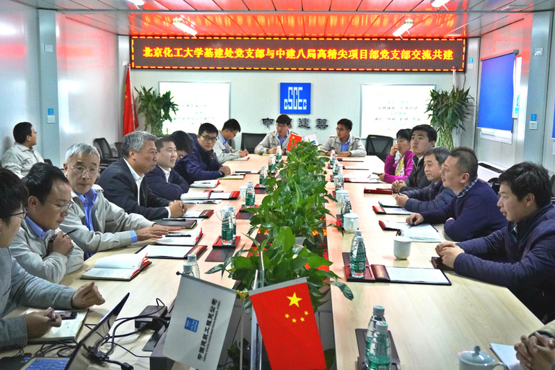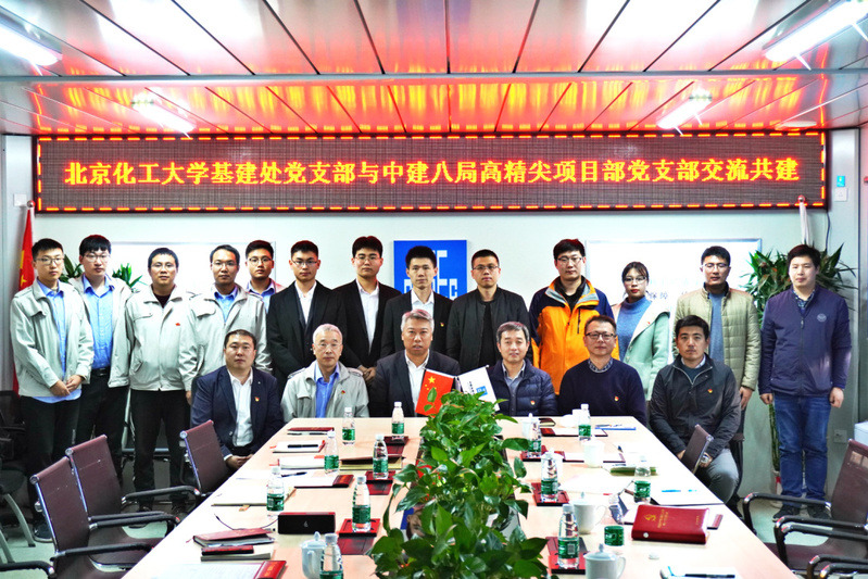 11月8日下午,基建处党支部与中建八局北京化工大学高精尖项目部党支部在中建八局通州新光大项目部党建室开展交流共建,基建处全体成员,中建八局党员及骨干参与会议,中建八局高精尖项目执行经理张浩主持了会议。