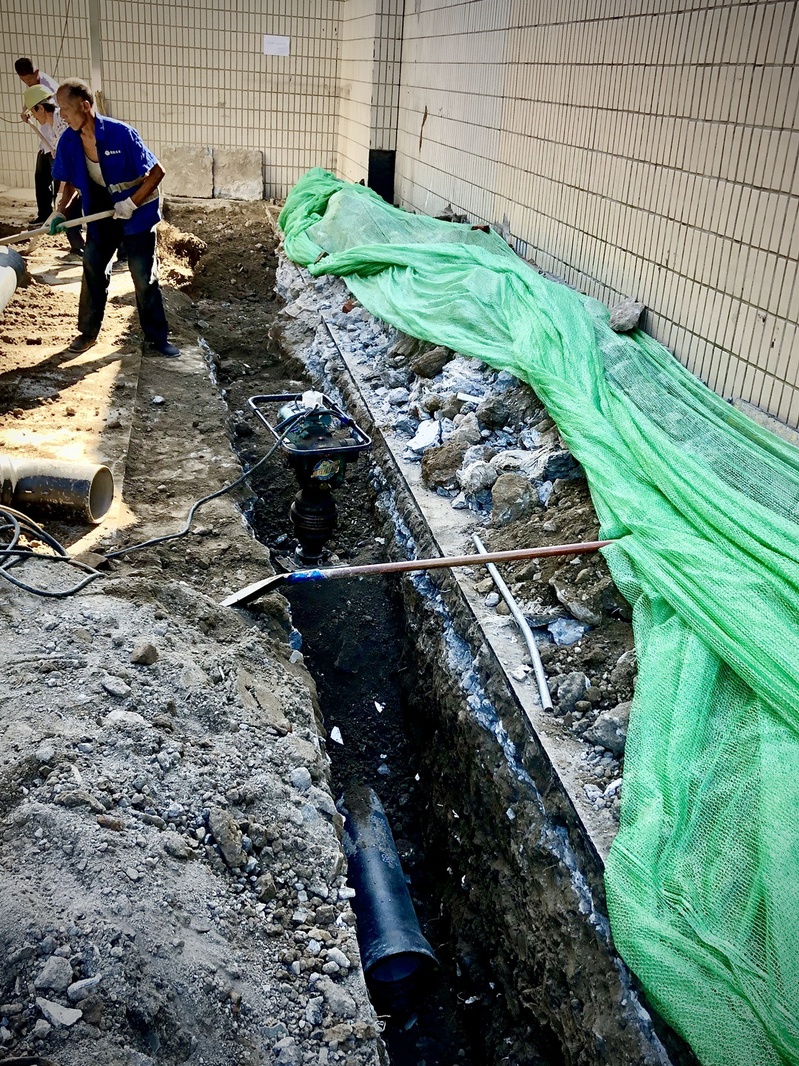 学校排除各种困难,经过勘测、设计、评估等工作后,2019年9月开始施工,2019年10月10日我校第二路供水管线与市政给水管线正式接通。